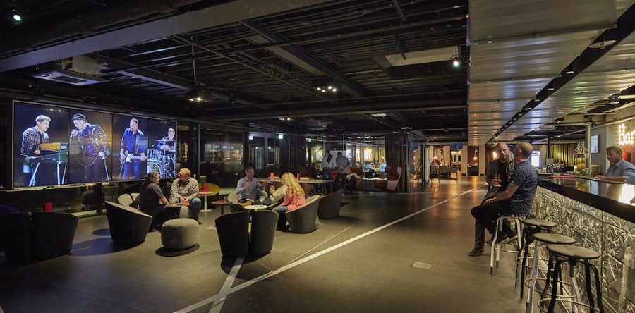 The new V8 Hotel, located within Motorworld in Cologne, Germany, has upgraded its lobby and bar area with an Atmosphere 4K system. This unique, free-hanging installation features an exclusive 4K media wall that displays the atmosphere breathtaking scenic content of landscapes and cityscapes, alongside original music content from 29 different bands and over 600 videos.